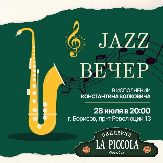 Мы знаем, что многие из вас любят живую музыку и хотели бы насладиться итальянскими блюдами в уютной атмосфере. Поэтому мы решили организовать этот вечер специально для вас. Итак, мы рады объявить о том, что 28 июля у нас состоится "Летний вечер с саксафоном!" с Константином Волковичем.